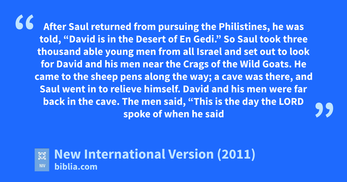 24 a After Saul returned from pursuing the Philistines, he was told, “David is in the Desert of En Gedi.g” 2 So Saul took three thousand able young men from all Israel and set out to lookh for David and his men near the Crags of the Wild Goats.