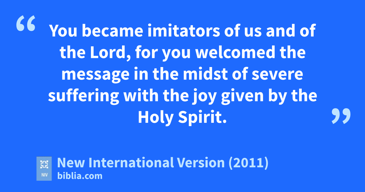 4 For we know, brothers and sistersb loved by God,k that he has chosen you, 5 because our gospell came to you not simply with words but also with power,m with the Holy Spirit and deep conviction. You known how we lived among you for your sake. 6 You became imitators of uso and of the Lord, for you welcomed the message in the midst of severe sufferingp with the joyq given by the Holy Spirit.r 7 And so you became a models to all the believers in Macedoniat and Achaia.u 8 The Lord’s messagev rang out from you not only in Macedonia and Achaia—your faith in God has become known everywhere.w Therefore we do not need to say anything about it, 9 for they themselves report what kind of reception you gave us. They tell how you turnedx to God from idolsy to serve the living and true God,z 10 and to wait for his Son from heaven,a whom he raised from the deadb—Jesus, who rescues us from the coming wrath.c