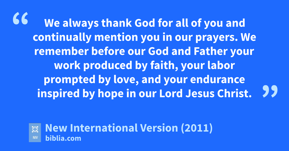2 We always thank God for all of youe and continually mention you in our prayers.f 3 We remember before our God and Fatherg your work produced by faith,h your labor prompted by love,i and your endurance inspired by hopej in our Lord Jesus Christ.