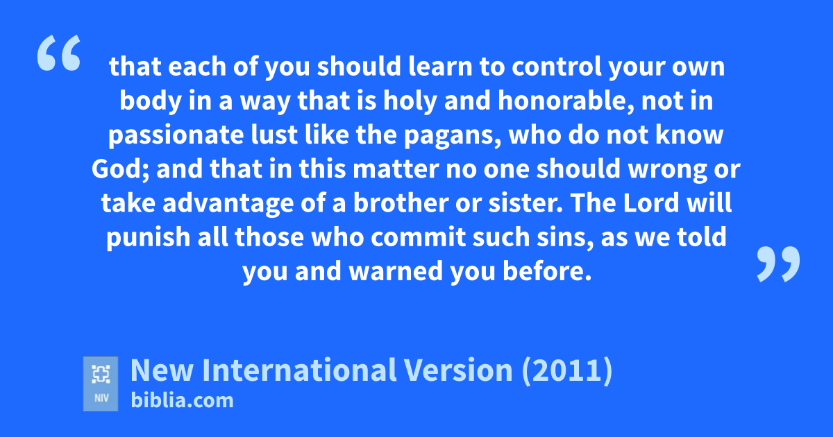 3 It is God’s willy that you should be sanctified: that you should avoid sexual immorality;z 4 that each of you should learn to control your own bodya a in a way that is holy and honorable, 5 not in passionate lustb like the pagans,c who do not know God;d 6 and that in this matter no one should wrong or take advantage of a brother or sister.b e The Lord will punishf all those who commit such sins,g as we told you and warned you before. 7 For God did not call us to be impure, but to live a holy life.h 8 Therefore, anyone who rejects this instruction does not reject a human being but God, the very God who gives you his Holy Spirit.i