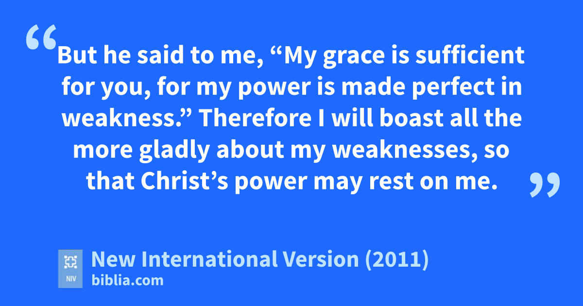 12 I must go on boasting.r Although there is nothing to be gained, I will go on to visions and revelationss from the Lord. 2 I know a man in Christt who fourteen years ago was caught upu to the third heaven.v Whether it was in the body or out of the body I do not know—God knows.w 3 And I know that this man—whether in the body or apart from the body I do not know, but God knows—4 was caught upx to paradisey and heard inexpressible things, things that no one is permitted to tell. 5 I will boast about a man like that, but I will not boast about myself, except about my weaknesses.z 6 Even if I should choose to boast,a I would not be a fool,b because I would be speaking the truth. But I refrain, so no one will think more of me than is warranted by what I do or say, 7 or because of these surpassingly great revelations.c Therefore, in order to keep me from becoming conceited, I was given a thorn in my flesh,d a messenger of Satan,e to torment me. 8 Three times I pleaded with the Lord to take it away from me.f 9 But he said to me, “My graceg is sufficient for you, for my powerh is made perfect in weakness.i”j Therefore I will boast all the more gladly about my weaknesses, so that Christ’s power may rest on me. 10 That is why, for Christ’s sake, I delightk in weaknesses, in insults, in hardships,l in persecutions,m in difficulties. For when I am weak, then I am strong.n