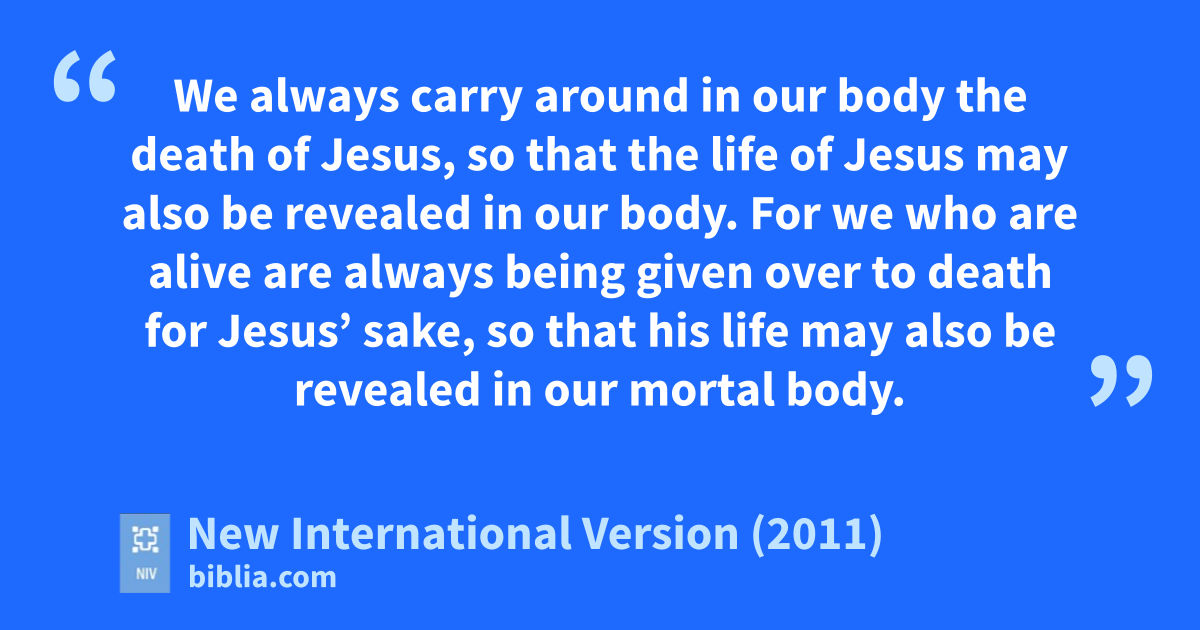 7 But we have this treasure in jars of clayw to show that this all-surpassing power is from Godx and not from us. 8 We are hard pressed on every side,y but not crushed; perplexed,z but not in despair; 9 persecuted,a but not abandoned;b struck down, but not destroyed.c 10 We always carry around in our body the death of Jesus,d so that the life of Jesus may also be revealed in our body.e 11 For we who are alive are always being given over to death for Jesus’ sake,f so that his life may also be revealed in our mortal body. 12 So then, death is at work in us, but life is at work in you.g