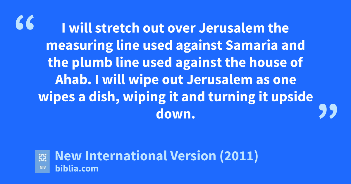 10 The Lord said through his servants the prophets: 11 “Manasseh king of Judah has committed these detestable sins. He has done more eviln than the Amoriteso who preceded him and has led Judah into sin with his idols.p 12 Therefore this is what the Lord, the God of Israel, says: I am going to bring such disasterq on Jerusalem and Judah that the ears of everyone who hears of it will tingle.r 13 I will stretch out over Jerusalem the measuring line used against Samaria and the plumb lines used against the house of Ahab. I will wipet out Jerusalem as one wipes a dish, wiping it and turning it upside down. 14 I will forsakeu the remnantv of my inheritance and give them into the hands of enemies. They will be looted and plundered by all their enemies; 15 they have done evilw in my eyes and have arousedx my anger from the day their ancestors came out of Egypt until this day.”