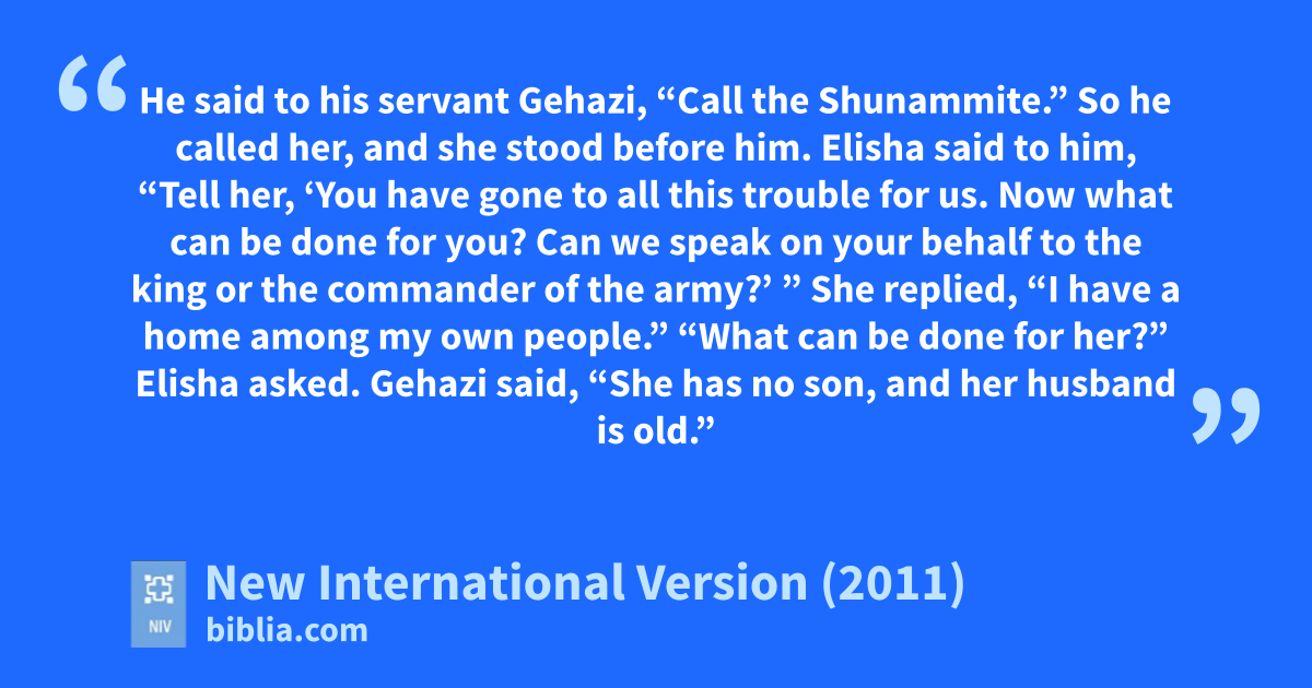 11 One day when Elisha came, he went up to his room and lay down there. 12 He said to his servant Gehazi, “Call the Shunammite.”h So he called her, and she stood before him. 13 Elisha said to him, “Tell her, ‘You have gone to all this trouble for us. Now what can be done for you? Can we speak on your behalf to the king or the commander of the army?’ ”