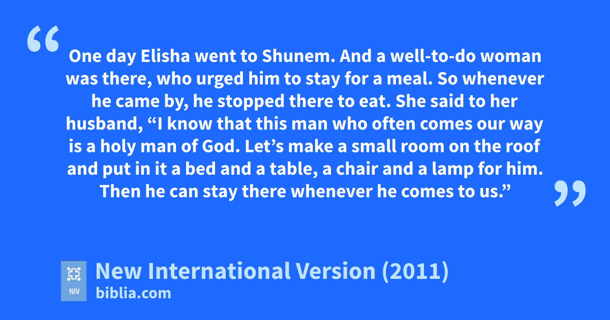 8 One day Elisha went to Shunem.f And a well-to-do woman was there, who urged him to stay for a meal. So whenever he came by, he stopped there to eat. 9 She said to her husband, “I know that this man who often comes our way is a holy man of God. 10 Let’s make a small room on the roof and put in it a bed and a table, a chair and a lamp for him. Then he can stayg there whenever he comes to us.”