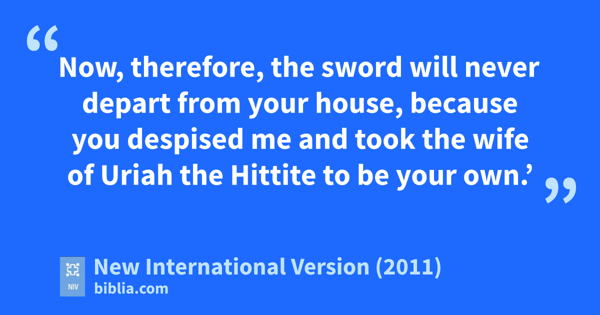 7 Then Nathan said to David, “You are the man!p This is what the Lord, the God of Israel, says: ‘I anointedq your king over Israel, and I delivered you from the hand of Saul. 8 I gave your master’s house to you,s and your master’s wives into your arms. I gave you all Israel and Judah. And if all this had been too little, I would have given you even more. 9 Why did you despiset the word of the Lord by doing what is evil in his eyes? You struck downu Uriahv the Hittite with the sword and took his wife to be your own. You killedw him with the sword of the Ammonites. 10 Now, therefore, the swordx will never depart from your house, because you despised me and took the wife of Uriah the Hittite to be your own.’