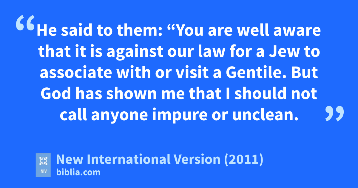 27 While talking with him, Peter went inside and found a large gathering of people.m 28 He said to them: “You are well aware that it is against our law for a Jew to associate with or visit a Gentile.n But God has shown me that I should not call anyone impure or unclean.o 29 So when I was sent for, I came without raising any objection. May I ask why you sent for me?”