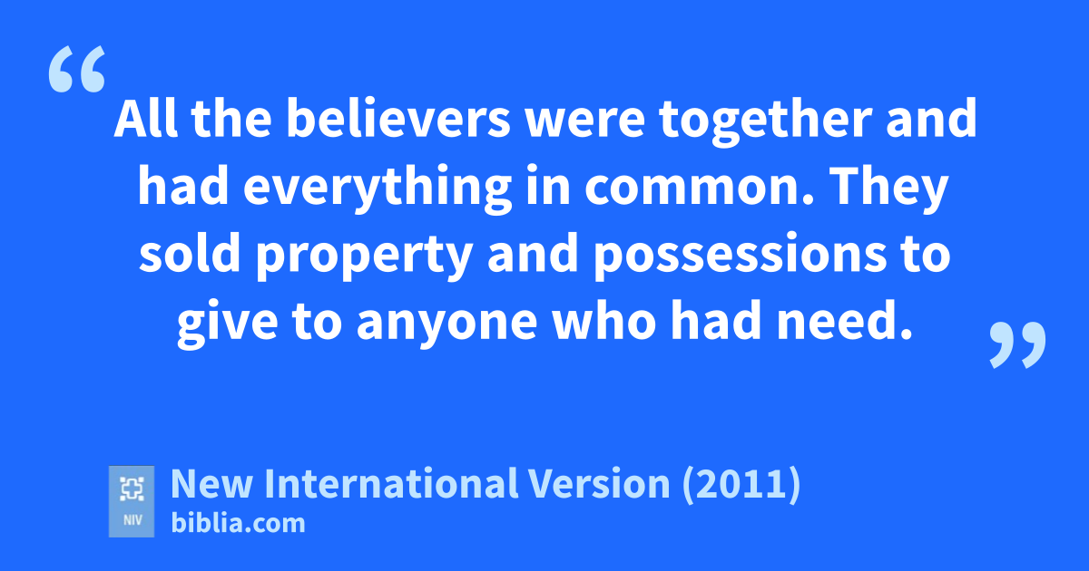 42 They devoted themselves to the apostles’ teachingx and to fellowship, to the breaking of bready and to prayer.z 43 Everyone was filled with awe at the many wonders and signs performed by the apostles.a 44 All the believers were together and had everything in common.b 45 They sold property and possessions to give to anyone who had need.c 46 Every day they continued to meet together in the temple courts.d They broke breade in their homes and ate together with glad and sincere hearts, 47 praising God and enjoying the favor of all the people.f And the Lord added to their numberg daily those who were being saved.