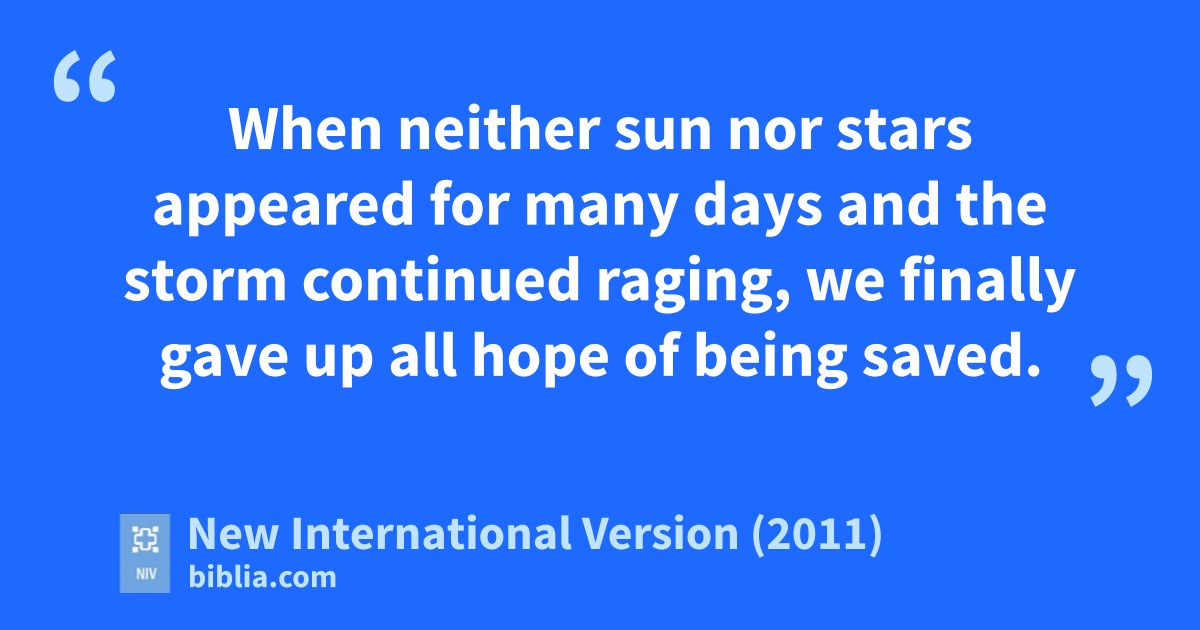 13 When a gentle south wind began to blow, they saw their opportunity; so they weighed anchor and sailed along the shore of Crete. 14 Before very long, a wind of hurricane force,i called the Northeaster, swept down from the island. 15 The ship was caught by the storm and could not head into the wind; so we gave way to it and were driven along. 16 As we passed to the lee of a small island called Cauda, we were hardly able to make the lifeboatj secure, 17 so the men hoisted it aboard. Then they passed ropes under the ship itself to hold it together. Because they were afraid they would run agroundk on the sandbars of Syrtis, they lowered the sea anchorb and let the ship be driven along. 18 We took such a violent battering from the storm that the next day they began to throw the cargo overboard.l 19 On the third day, they threw the ship’s tackle overboard with their own hands. 20 When neither sun nor stars appeared for many days and the storm continued raging, we finally gave up all hope of being saved.