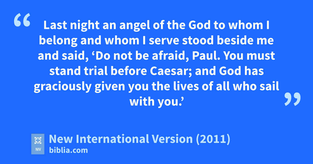 21 After they had gone a long time without food, Paul stood up before them and said: “Men, you should have taken my advicem not to sail from Crete;n then you would have spared yourselves this damage and loss. 22 But now I urge you to keep up your courage,o because not one of you will be lost; only the ship will be destroyed. 23 Last night an angelp of the God to whom I belong and whom I serveq stood beside mer 24 and said, ‘Do not be afraid, Paul. You must stand trial before Caesar;s and God has graciously given you the lives of all who sail with you.’t 25 So keep up your courage,u men, for I have faith in God that it will happen just as he told me.v 26 Nevertheless, we must run agroundw on some island.”x
