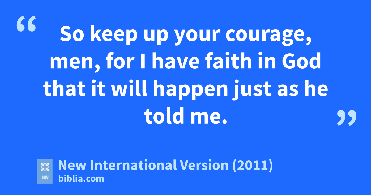 21 After they had gone a long time without food, Paul stood up before them and said: “Men, you should have taken my advicem not to sail from Crete;n then you would have spared yourselves this damage and loss. 22 But now I urge you to keep up your courage,o because not one of you will be lost; only the ship will be destroyed. 23 Last night an angelp of the God to whom I belong and whom I serveq stood beside mer 24 and said, ‘Do not be afraid, Paul. You must stand trial before Caesar;s and God has graciously given you the lives of all who sail with you.’t 25 So keep up your courage,u men, for I have faith in God that it will happen just as he told me.v 26 Nevertheless, we must run agroundw on some island.”x