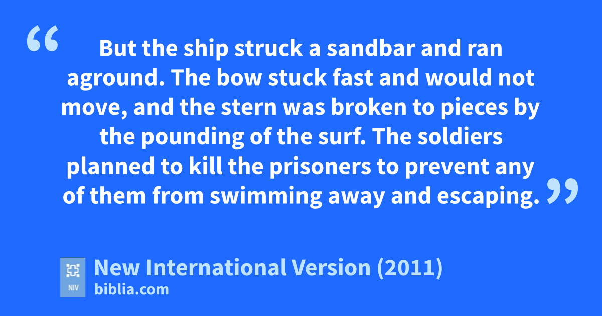 39 When daylight came, they did not recognize the land, but they saw a bay with a sandy beach,e where they decided to run the ship aground if they could. 40 Cutting loose the anchors,f they left them in the sea and at the same time untied the ropes that held the rudders. Then they hoisted the foresail to the wind and made for the beach. 41 But the ship struck a sandbar and ran aground. The bow stuck fast and would not move, and the stern was broken to pieces by the pounding of the surf.g