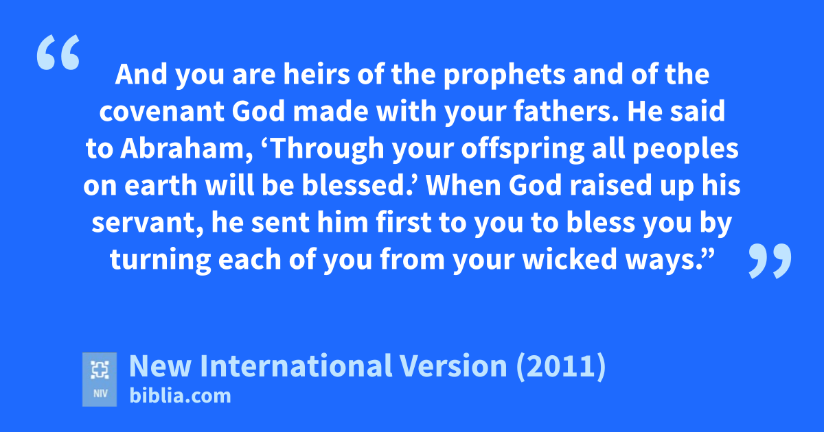 24 “Indeed, beginning with Samuel, all the prophetss who have spoken have foretold these days. 25 And you are heirst of the prophets and of the covenantu God made with your fathers. He said to Abraham, ‘Through your offspring all peoples on earth will be blessed.’b v 26 When God raised upw his servant, he sent him firstx to you to bless you by turning each of you from your wicked ways.”