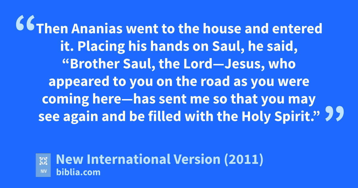 17 Then Ananias went to the house and entered it. Placing his hands onz Saul, he said, “Brother Saul, the Lord—Jesus, who appeared to you on the road as you were coming here—has sent me so that you may see again and be filled with the Holy Spirit.”a 18 Immediately, something like scales fell from Saul’s eyes, and he could see again. He got up and was baptized,b 19 and after taking some food, he regained his strength.