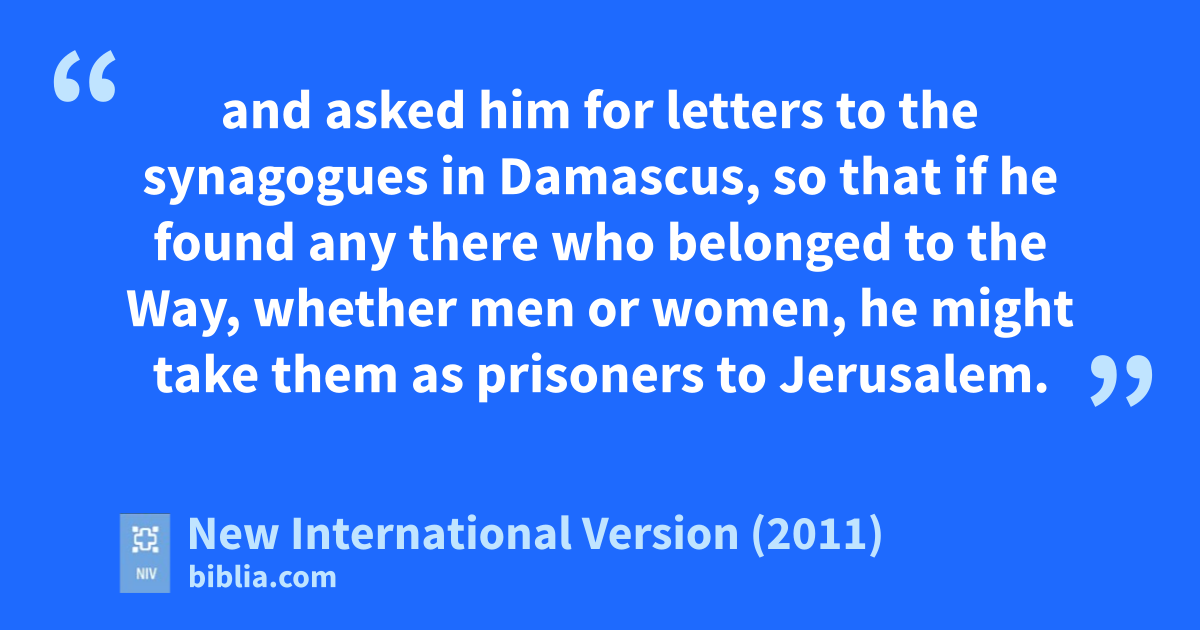 9 Meanwhile, Saul was still breathing out murderous threats against the Lord’s disciples.f He went to the high priest 2 and asked him for letters to the synagogues in Damascus,g so that if he found any there who belonged to the Way,h whether men or women, he might take them as prisoners to Jerusalem. 3 As he neared Damascus on his journey, suddenly a light from heaven flashed around him.i 4 He fell to the ground and heard a voicej say to him, “Saul, Saul, why do you persecute me?”