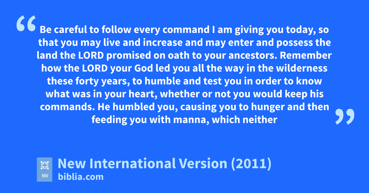 8 Be careful to follow every command I am giving you today, so that you may livet and increase and may enter and possess the land the Lord promised on oath to your ancestors.u 2 Remember how the Lord your God ledv you all the way in the wilderness these forty years, to humble and testw you in order to know what was in your heart, whether or not you would keep his commands. 3 He humbledx you, causing you to hunger and then feeding you with manna,y which neither you nor your ancestors had known, to teachz you that man does not live on breada alone but on every word that comes from the mouthb of the Lord.c 4 Your clothes did not wear out and your feet did not swell during these forty years.d 5 Know then in your heart that as a man disciplines his son, so the Lord your God disciplines you.e
