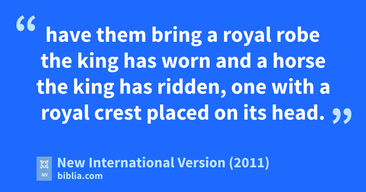 Now Haman thought to himself, “Who is there that the king would rather honor than me?” 7 So he answered the king, “For the man the king delights to honor, 8 have them bring a royal robef the king has worn and a horseg the king has ridden, one with a royal crest placed on its head. 9 Then let the robe and horse be entrusted to one of the king’s most noble princes. Let them robe the man the king delights to honor, and lead him on the horse through the city streets, proclaiming before him, ‘This is what is done for the man the king delights to honor!h’ ”