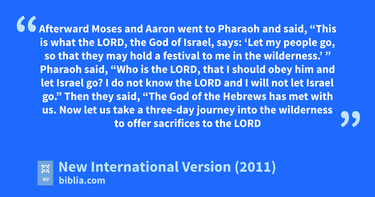 5 Afterward Moses and Aaron went to Pharaoh and said, “This is what the Lord, the God of Israel, says: ‘Let my people go,j so that they may hold a festivalk to me in the wilderness.’ ”