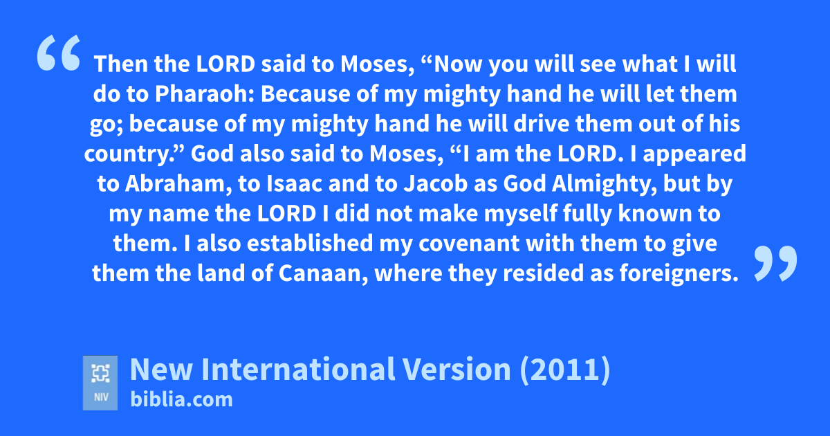 2 God also said to Moses, “I am the Lord.k 3 I appeared to Abraham, to Isaac and to Jacob as God Almighty,a l but by my namem the Lordb n I did not make myself fully known to them. 4 I also established my covenanto with them to give them the landp of Canaan, where they resided as foreigners.q 5 Moreover, I have heard the groaningr of the Israelites, whom the Egyptians are enslaving, and I have remembered my covenant.s