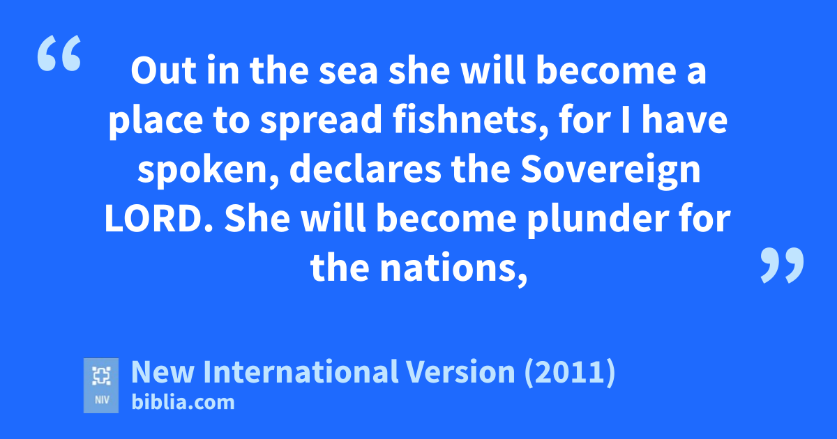 26 In the eleventh month of the twelftha year, on the first day of the month, the word of the Lord came to me:d 2 “Son of man, because Tyree has said of Jerusalem, ‘Aha!f The gate to the nations is broken, and its doors have swung open to me; now that she lies in ruins I will prosper,’ 3 therefore this is what the Sovereign Lord says: I am against you, Tyre, and I will bring many nations against you, like the seag casting up its waves. 4 They will destroyh the walls of Tyrei and pull down her towers; I will scrape away her rubble and make her a bare rock. 5 Out in the seaj she will become a place to spread fishnets,k for I have spoken, declares the Sovereign Lord. She will become plunderl for the nations,m 6 and her settlements on the mainland will be ravaged by the sword. Then they will know that I am the Lord.