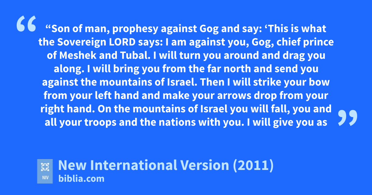 39 “Son of man, prophesy against Gogm and say: ‘This is what the Sovereign Lord says: I am against you, Gog, chief prince ofa Meshekn and Tubal.o 2 I will turn you around and drag you along. I will bring you from the far northp and send you against the mountains of Israel.q 3 Then I will strike your bowr from your left hand and make your arrowss drop from your right hand. 4 On the mountains of Israel you will fall, you and all your troops and the nations with you. I will give you as food to all kinds of carrion birdst and to the wild animals.u 5 You will fall in the open field, for I have spoken, declares the Sovereign Lord.v 6 I will send firew on Magogx and on those who live in safety in the coastlands,y and they will knowz that I am the Lord.