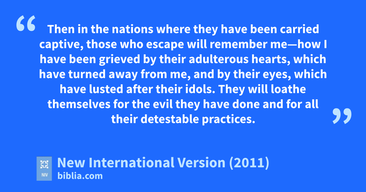 8 “ ‘But I will spare some, for some of you will escapec the sword when you are scattered among the lands and nations.d 9 Then in the nations where they have been carried captive, those who escape will remembere me—how I have been grievedf by their adulterous hearts, which have turned away from me, and by their eyes, which have lusted after their idols.g They will loathe themselves for the evilh they have done and for all their detestable practices.i 10 And they will know that I am the Lord;j I did not threaten in vain to bring this calamity on them.k
