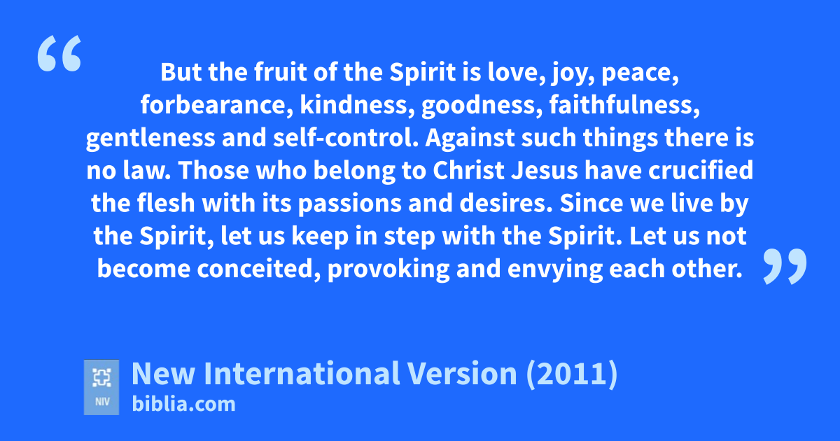 22 But the fruitu of the Spirit is love,v joy, peace,w forbearance, kindness, goodness, faithfulness, 23 gentleness and self-control.x Against such things there is no law.y 24 Those who belong to Christ Jesus have crucified the fleshz with its passions and desires.a 25 Since we live by the Spirit,b let us keep in step with the Spirit. 26 Let us not become conceited,c provoking and envying each other.