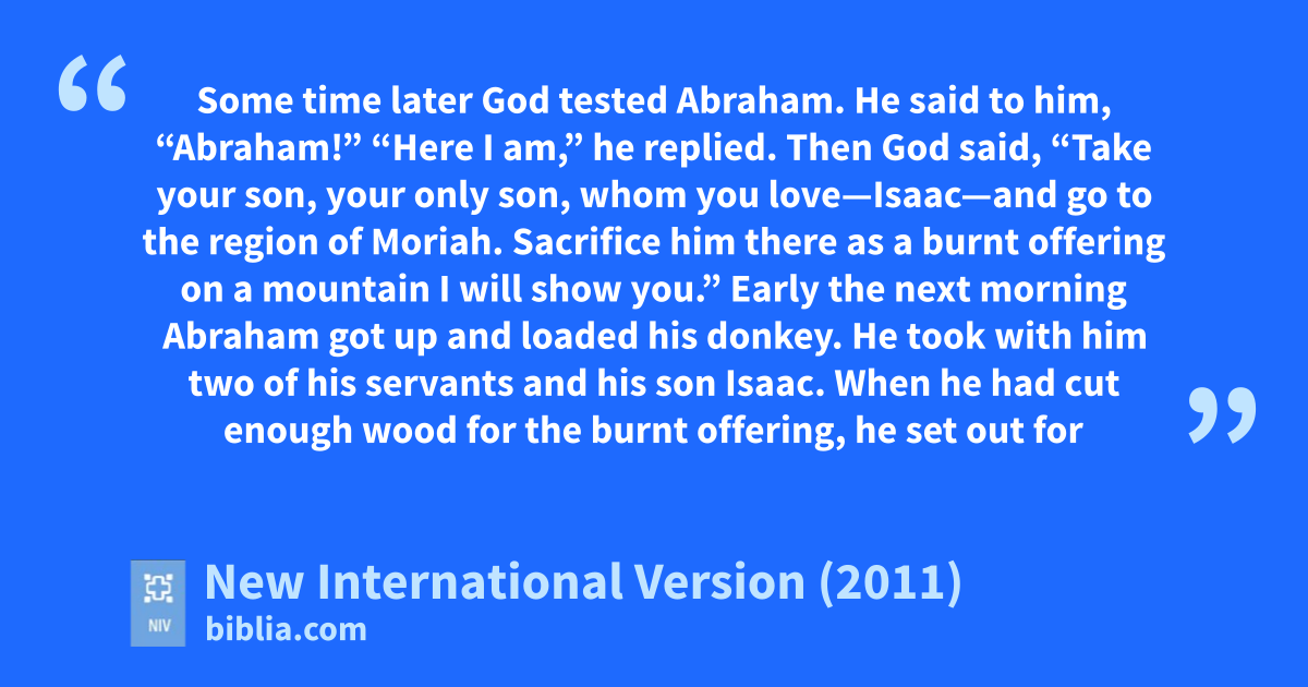 2 Then God said, “Take your sonc, your only son, whom you love—Isaac—and go to the region of Moriah.d Sacrifice him there as a burnt offeringe on a mountain I will show you.f”