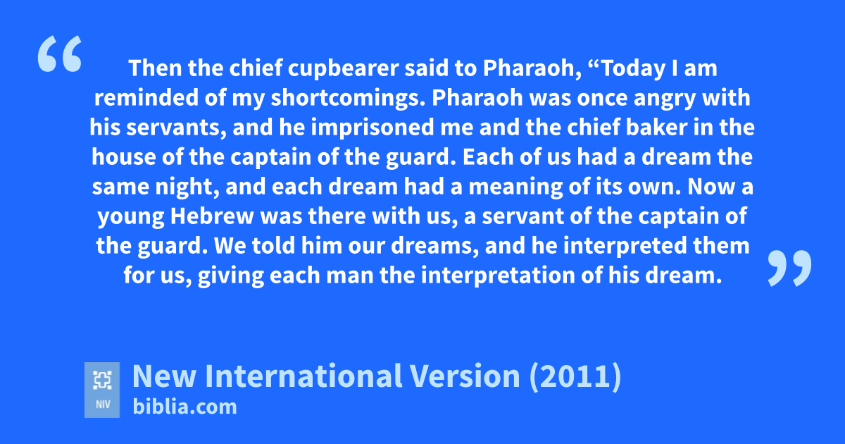 9 Then the chief cupbearer said to Pharaoh, “Today I am reminded of my shortcomings.p 10 Pharaoh was once angry with his servants,q and he imprisoned me and the chief baker in the house of the captain of the guard.r 11 Each of us had a dream the same night, and each dream had a meaning of its own.s 12 Now a young Hebrewt was there with us, a servant of the captain of the guard.u We told him our dreams, and he interpreted them for us, giving each man the interpretation of his dream.v 13 And things turned out exactly as he interpreted them to us: I was restored to my position, and the other man was impaled.w”