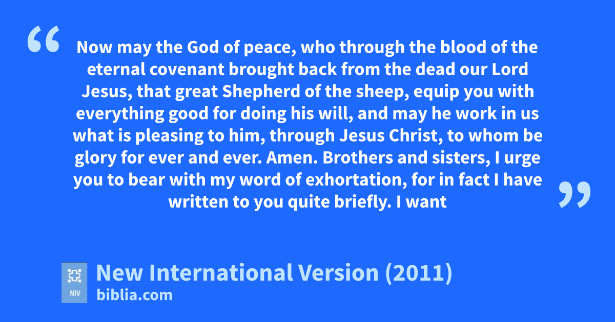 20 Now may the God of peace,w who through the blood of the eternal covenantx brought back from the deady our Lord Jesus, that great Shepherd of the sheep,z 21 equip you with everything good for doing his will,a and may he work in usb what is pleasing to him,c through Jesus Christ, to whom be glory for ever and ever. Amen.d