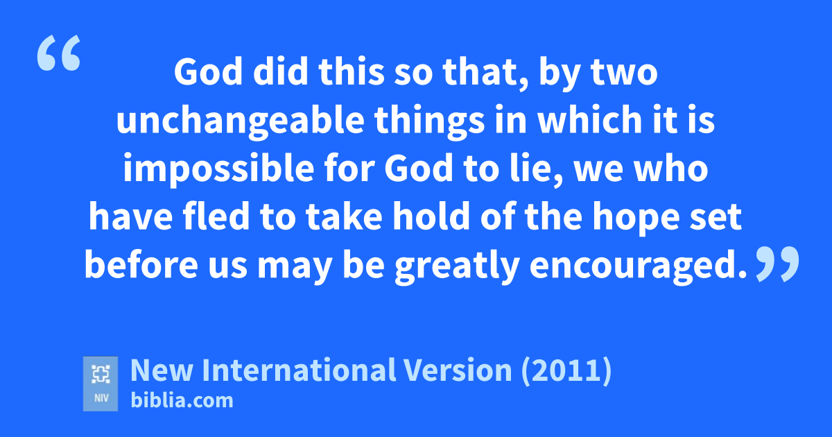 16 People swear by someone greater than themselves, and the oath confirms what is said and puts an end to all argument.w 17 Because God wanted to make the unchangingx nature of his purpose very clear to the heirs of what was promised,y he confirmed it with an oath. 18 God did this so that, by two unchangeable things in which it is impossible for God to lie,z we who have fled to take hold of the hopea set before us may be greatly encouraged. 19 We have this hope as an anchor for the soul, firm and secure. It enters the inner sanctuary behind the curtain,b 20 where our forerunner, Jesus, has entered on our behalf.c He has become a high priestd forever, in the order of Melchizedek.e