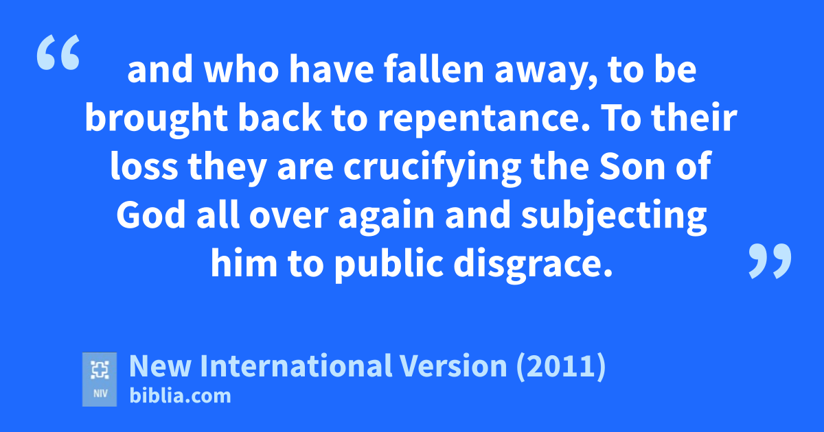4 It is impossible for those who have once been enlightened,f who have tasted the heavenly gift,g who have shared in the Holy Spirit,h 5 who have tasted the goodnessi of the word of Godj and the powers of the coming age 6 and who have fallenc away, to be brought back to repentance.k To their loss they are crucifying the Son of Godl all over again and subjecting him to public disgrace. 7 Land that drinks in the rain often falling on it and that produces a crop useful to those for whom it is farmed receives the blessing of God. 8 But land that produces thorns and thistles is worthless and is in danger of being cursed.m In the end it will be burned.