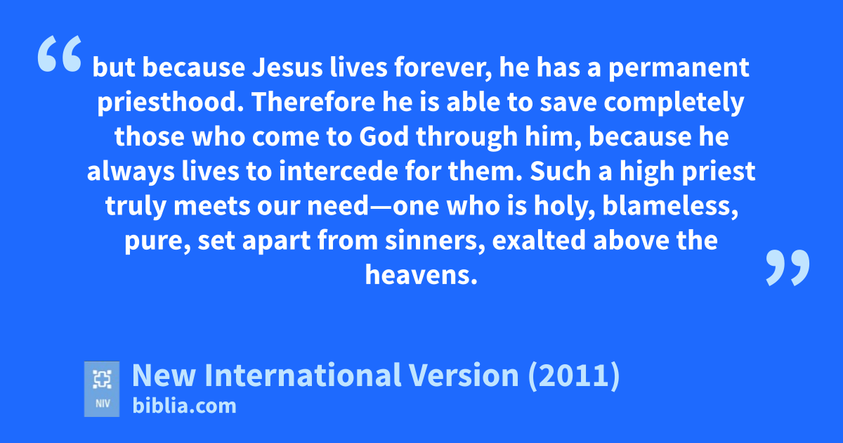 23 Now there have been many of those priests, since death prevented them from continuing in office; 24 but because Jesus lives forever, he has a permanent priesthood.e 25 Therefore he is able to savef completelyc those who come to Godg through him, because he always lives to intercede for them.h