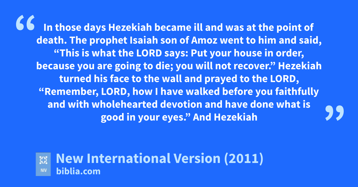 38 In those days Hezekiah became ill and was at the point of death. The prophet Isaiah son of Amozk went to him and said, “This is what the Lord says: Put your house in order,l because you are going to die; you will not recover.”m