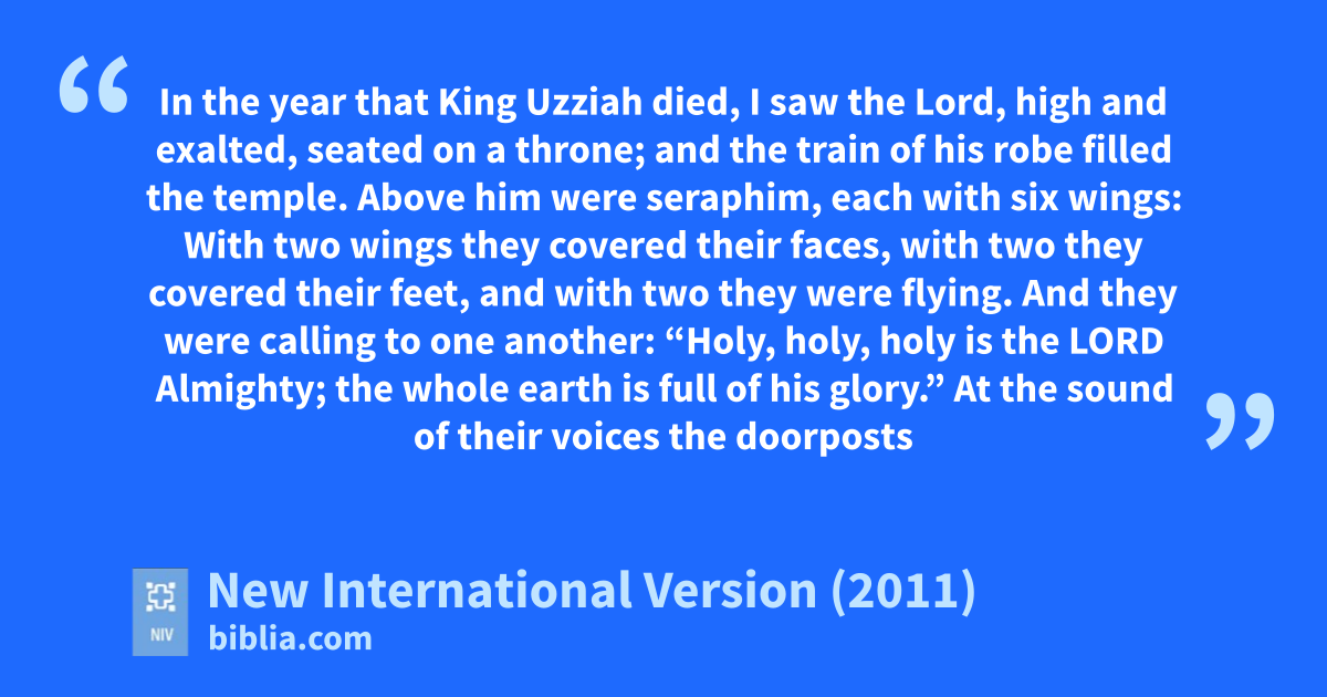 6 In the year that King Uzziahg died,h I saw the Lord,i high and exalted,j seated on a throne;k and the train of his robel filled the temple. 2 Above him were seraphim,m each with six wings: With two wings they covered their faces, with two they covered their feet,n and with two they were flying. 3 And they were calling to one another: