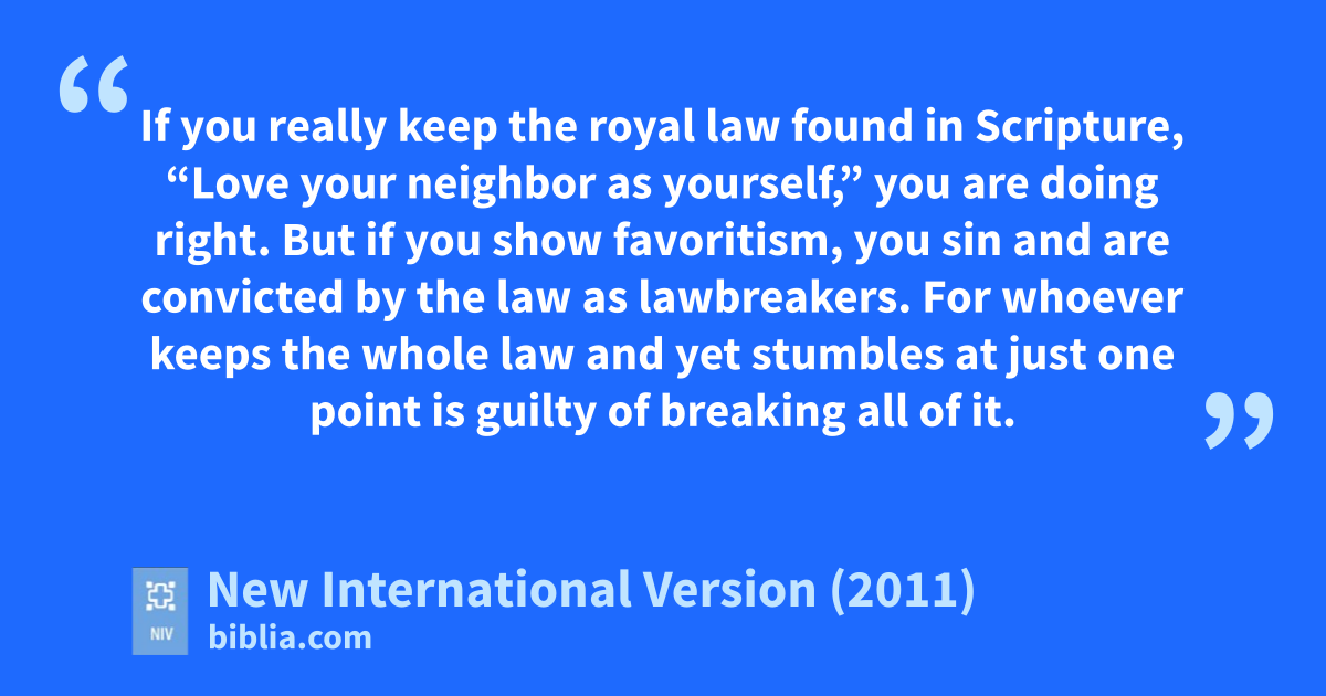 8 If you really keep the royal law found in Scripture, “Love your neighbor as yourself,”a d you are doing right. 9 But if you show favoritism,e you sin and are convicted by the law as lawbreakers.f 10 For whoever keeps the whole law and yet stumblesg at just one point is guilty of breaking all of it.h 11 For he who said, “You shall not commit adultery,”b i also said, “You shall not murder.”c j If you do not commit adultery but do commit murder, you have become a lawbreaker.
