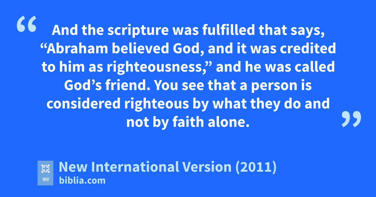 20 You foolish person, do you want evidence that faith without deeds is uselessd?w 21 Was not our father Abraham considered righteous for what he did when he offered his son Isaac on the altar?x 22 You see that his faith and his actions were working together,y and his faith was made complete by what he did.z 23 And the scripture was fulfilled that says, “Abraham believed God, and it was credited to him as righteousness,”e a and he was called God’s friend.b 24 You see that a person is considered righteous by what they do and not by faith alone.