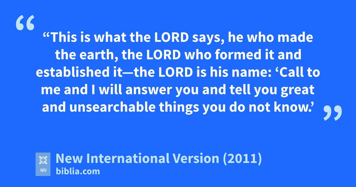 33 While Jeremiah was still confinedb in the courtyardc of the guard, the word of the Lord came to him a second time:d 2 “This is what the Lord says, he who made the earth,e the Lord who formed it and established it—the Lord is his name:f 3 ‘Callg to me and I will answer you and tell you great and unsearchableh things you do not know.’ 4 For this is what the Lord, the God of Israel, says about the houses in this city and the royal palaces of Judah that have been torn down to be used against the siegei rampsj and the sword 5 in the fight with the Babyloniansa: ‘They will be filled with the dead bodies of the people I will slay in my anger and wrath.k I will hide my facel from this city because of all its wickedness.
