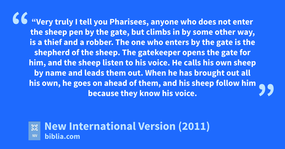 10 “Very truly I tell you Pharisees, anyone who does not enter the sheep pen by the gate, but climbs in by some other way, is a thief and a robber.g 2 The one who enters by the gate is the shepherd of the sheep.h 3 The gatekeeper opens the gate for him, and the sheep listen to his voice.i He calls his own sheep by name and leads them out.j 4 When he has brought out all his own, he goes on ahead of them, and his sheep follow him because they know his voice.k 5 But they will never follow a stranger; in fact, they will run away from him because they do not recognize a stranger’s voice.” 6 Jesus used this figure of speech,l but the Pharisees did not understand what he was telling them.m