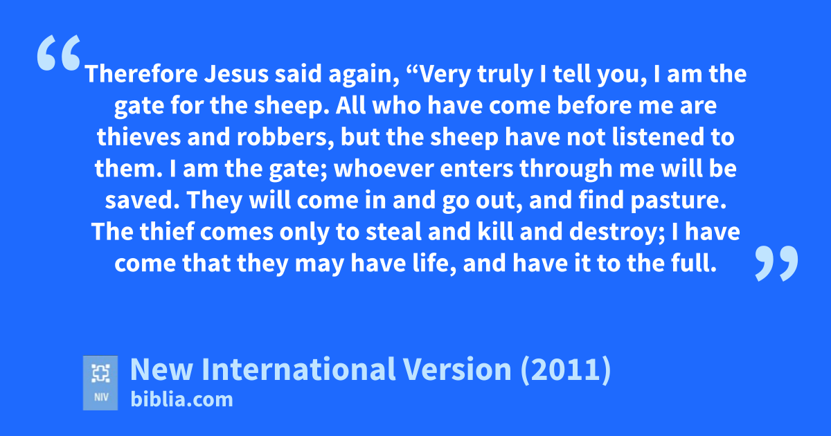 7 Therefore Jesus said again, “Very truly I tell you, I amn the gateo for the sheep. 8 All who have come before mep are thieves and robbers,q but the sheep have not listened to them. 9 I am the gate; whoever enters through me will be saved.a They will come in and go out, and find pasture. 10 The thief comes only to steal and kill and destroy; I have come that they may have life,r and have it to the full.s