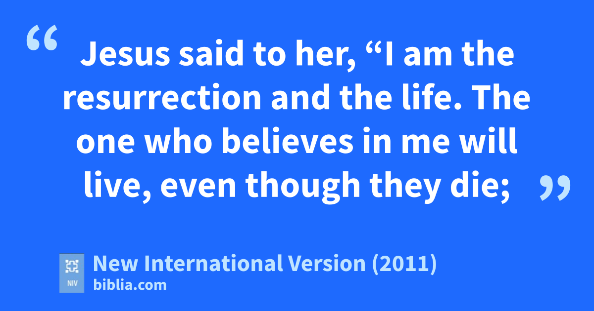 25 Jesus said to her, “I amn the resurrection and the life.o The one who believesp in me will live, even though they die; 26 and whoever lives by believingq in me will never die.r Do you believe this?”