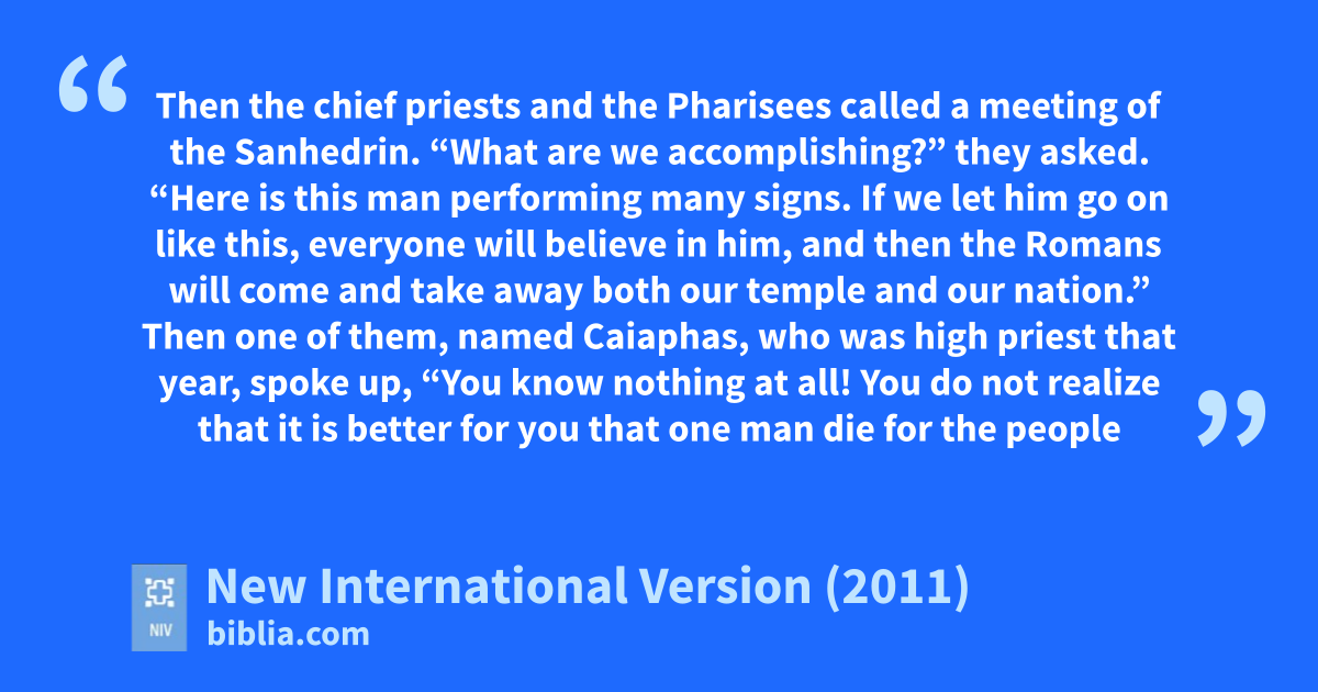 49 Then one of them, named Caiaphas,y who was high priest that year,z spoke up, “You know nothing at all! 50 You do not realize that it is better for you that one man die for the people than that the whole nation perish.”a
