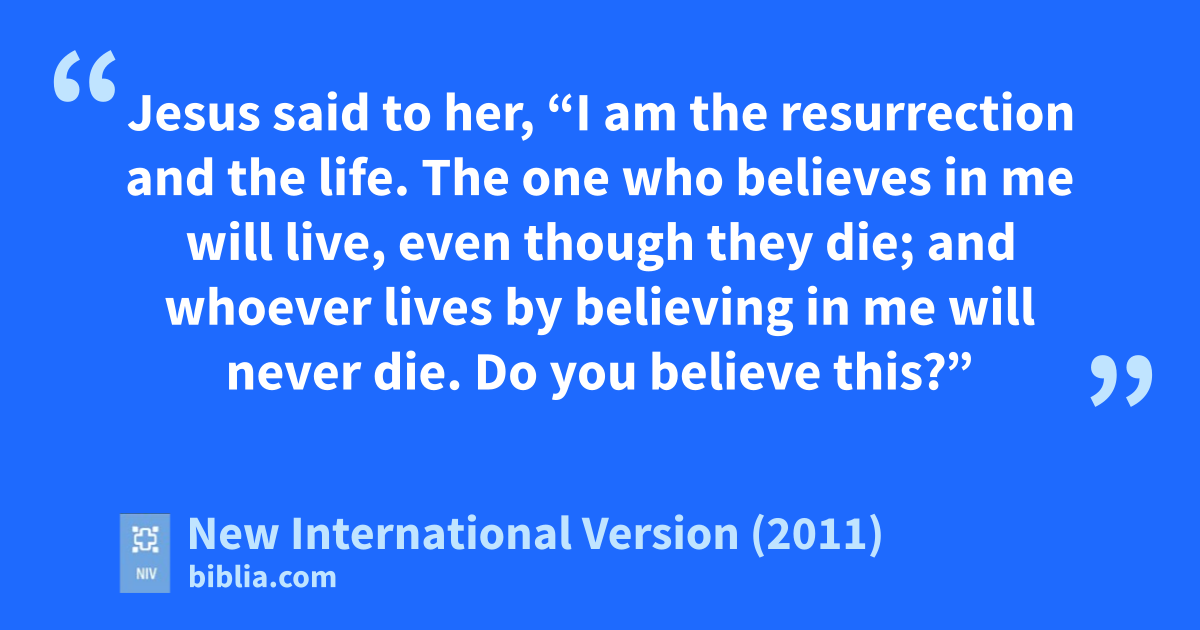 25 Jesus said to her, “I amn the resurrection and the life.o The one who believesp in me will live, even though they die; 26 and whoever lives by believingq in me will never die.r Do you believe this?”