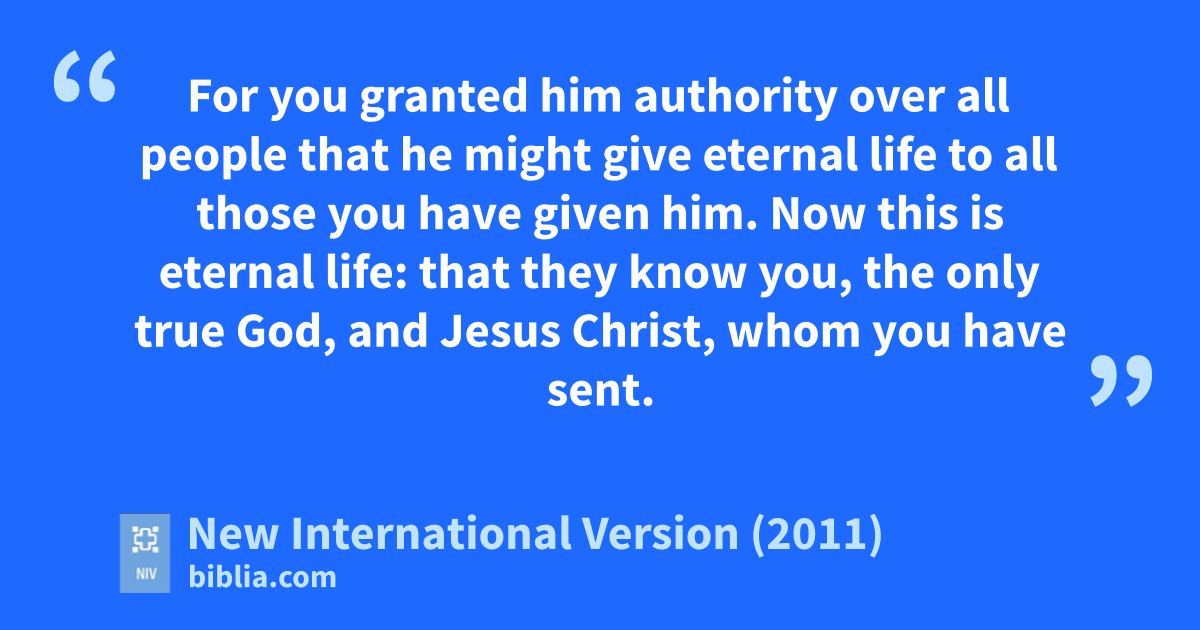 “Father, the hour has come.i Glorify your Son, that your Son may glorify you.j 2 For you granted him authority over all peoplek that he might give eternal lifel to all those you have given him.m 3 Now this is eternal life: that they know you,n the only true God, and Jesus Christ, whom you have sent.o 4 I have brought you gloryp on earth by finishing the work you gave me to do.q 5 And now, Father, glorify mer in your presence with the glory I had with yous before the world began.t