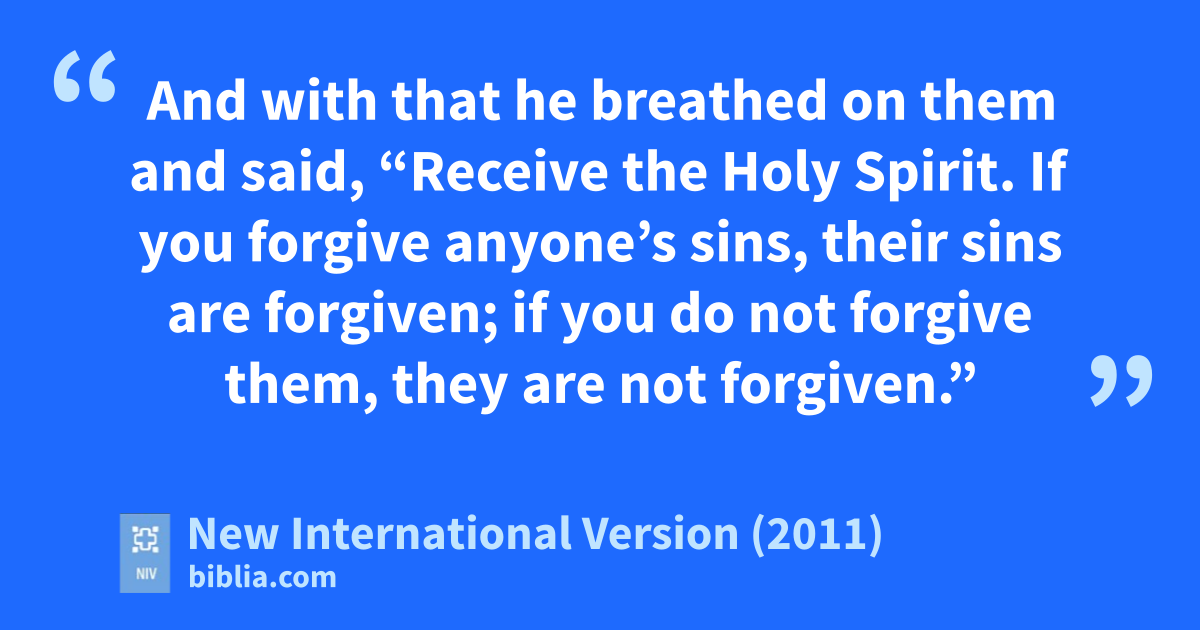 21 Again Jesus said, “Peace be with you!i As the Father has sent me,j I am sending you.”k 22 And with that he breathed on them and said, “Receive the Holy Spirit.l 23 If you forgive anyone’s sins, their sins are forgiven; if you do not forgive them, they are not forgiven.”m