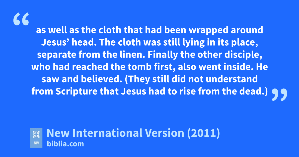 3 So Peter and the other disciple started for the tomb.j 4 Both were running, but the other disciple outran Peter and reached the tomb first. 5 He bent over and looked ink at the strips of linenl lying there but did not go in. 6 Then Simon Peter came along behind him and went straight into the tomb. He saw the strips of linen lying there, 7 as well as the cloth that had been wrapped around Jesus’ head.m The cloth was still lying in its place, separate from the linen. 8 Finally the other disciple, who had reached the tomb first,n also went inside. He saw and believed. 9 (They still did not understand from Scriptureo that Jesus had to rise from the dead.)p 10 Then the disciples went back to where they were staying.