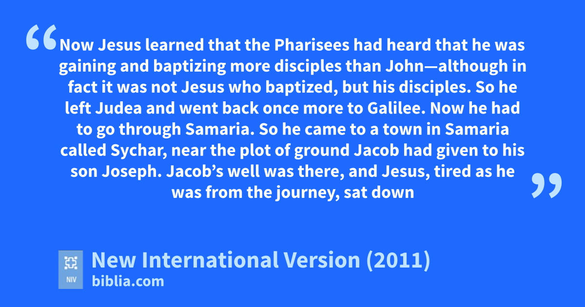 4 Now he had to go through Samaria.b 5 So he came to a town in Samaria called Sychar, near the plot of ground Jacob had given to his son Joseph.c 6 Jacob’s well was there, and Jesus, tired as he was from the journey, sat down by the well. It was about noon.