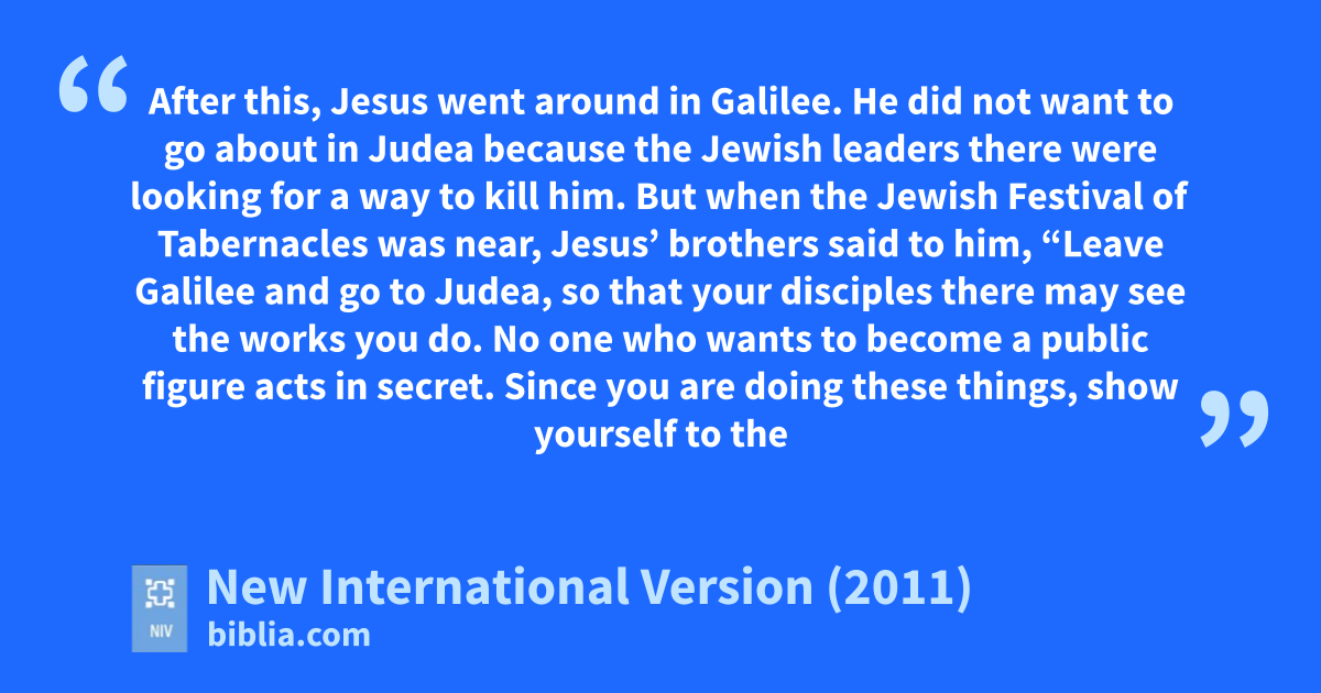 7 After this, Jesus went around in Galilee. He did not wanta to go about in Judea because the Jewish leaderse there were looking for a way to kill him.f 2 But when the Jewish Festival of Tabernaclesg was near, 3 Jesus’ brothersh said to him, “Leave Galilee and go to Judea, so that your disciples there may see the works you do. 4 No one who wants to become a public figure acts in secret. Since you are doing these things, show yourself to the world.” 5 For even his own brothers did not believe in him.i