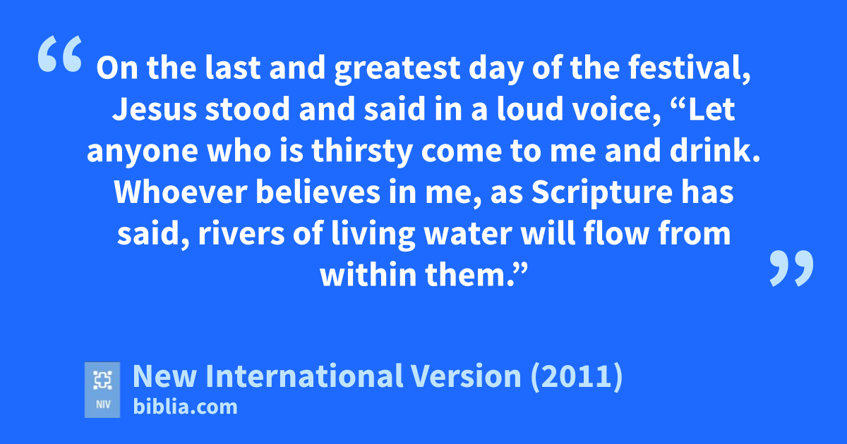 37 On the last and greatest day of the festival,x Jesus stood and said in a loud voice, “Let anyone who is thirsty come to me and drink.y 38 Whoever believesz in me, as Scripture has said,a rivers of living waterb will flow from within them.”c c 39 By this he meant the Spirit,d whom those who believed in him were later to receive.e Up to that time the Spirit had not been given, since Jesus had not yet been glorified.f