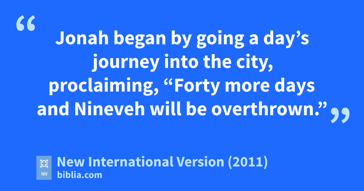 3 Jonah obeyed the word of the Lord and went to Nineveh. Now Nineveh was a very large city; it took three days to go through it. 4 Jonah began by going a day’s journey into the city, proclaiming,u “Forty more days and Nineveh will be overthrown.” 5 The Ninevites believed God. A fast was proclaimed, and all of them, from the greatest to the least, put on sackcloth.v